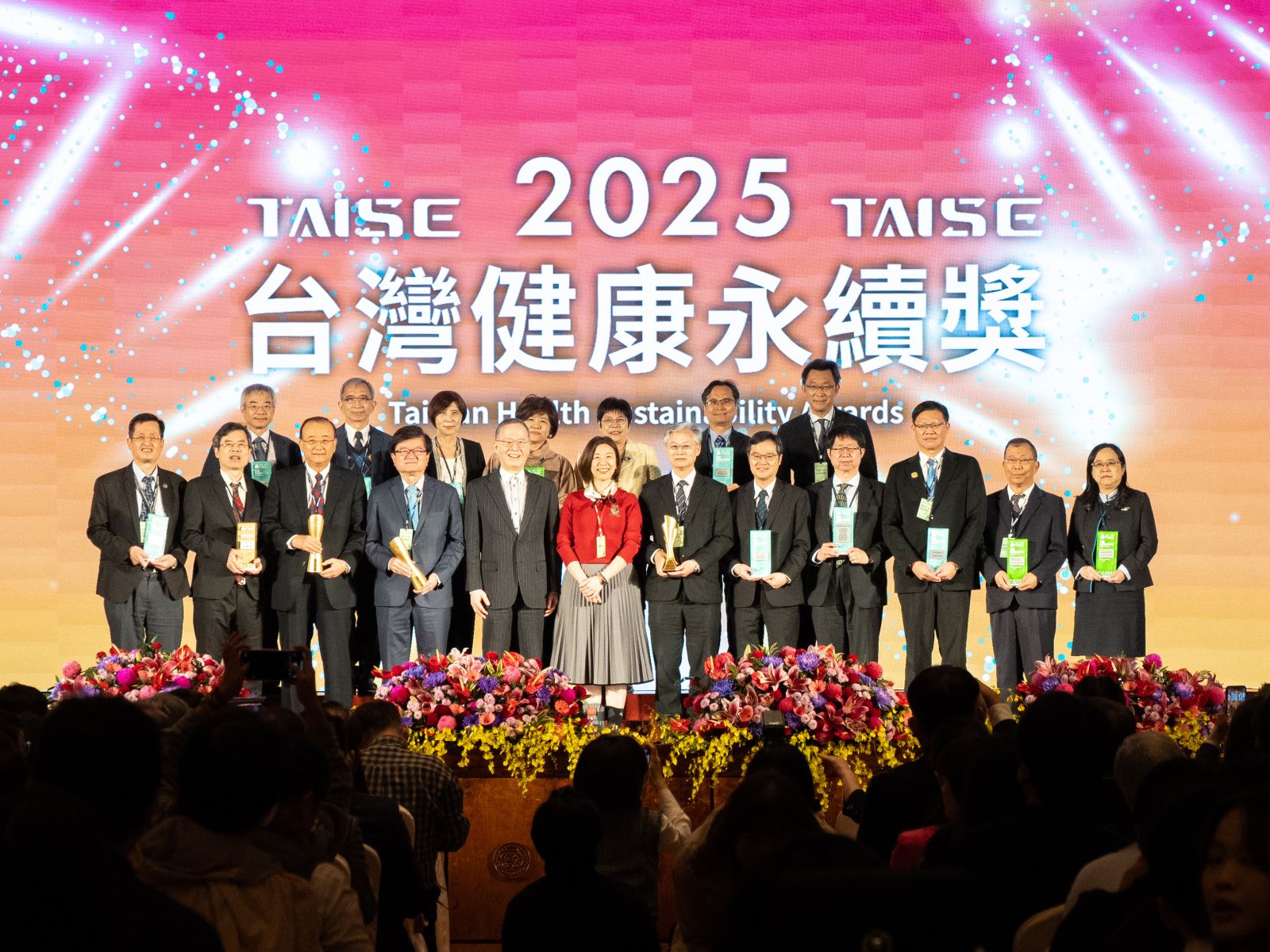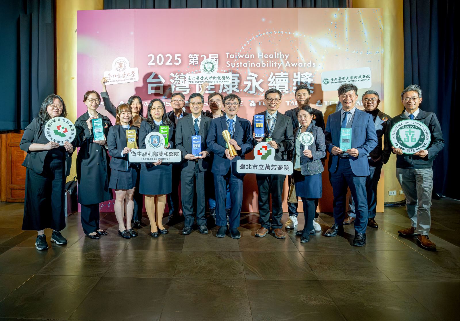 臺北醫學大學附設醫院獲頒「永續報告書獎銀級」,並榮獲「社會共融」、「高齡友善」、「智慧醫療」三項單項績效領袖獎,展現其跨域整合醫療、科技與社會參與的實踐成果,包括攜手社區推動高齡照護模式創新,以及運用AI技術進行再住院風險預警、強化照護品質;萬芳醫院獲頒「永續報告書金級獎」,並於「氣候領袖」、「職場福祉」兩項面向獲領袖獎肯定,彰顯其於智慧節能與職場友善政策的具體作為與成效;雙和醫院榮獲「永續報告書獎白金級」,並獲選為「台灣永續優質醫院」,肯定其在永續治理、病人安全與社區健康促進等面向的系統化推動與實質成果。