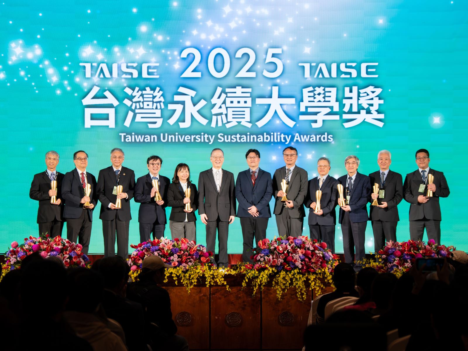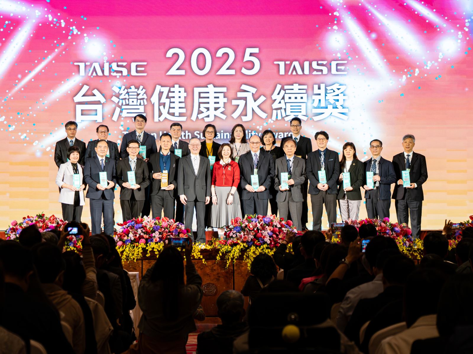 圖說:北醫大校長吳麥斯(前排中)率領學校與附屬醫院團隊領獎,共同抱回多項永續獎項,展現北醫體系卓越的永續表現。