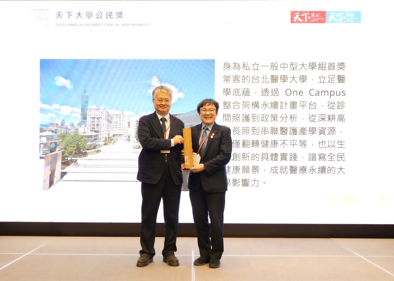 今年天下USR大學公民獎評選新設影響力專案,北醫大以「醫學專業的公共轉型:北醫大建構社會影響力的公民大學實踐模式」為主軸,呈現學校將社會責任與永續發展融入校務治理、教學研究及場域實踐的整體成果。