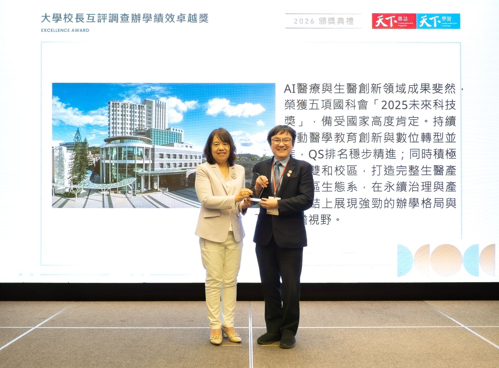 臺北醫學大學辦學成果再獲肯定,榮獲2026天下USR大學公民獎私立一般中型大學第一名;在先前已公布的大學校長辦學績效互評中,並列第八,並於4月15日頒獎典禮中同獲表揚,展現學校在校務治理、教學創新、社會參與及整體辦學表現上的綜合實力。